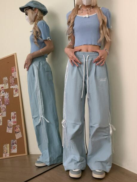 リボンラインパンツズボンボトムススウェット 裾絞りロングワイド太い太め大きいサイズビッグジャージ ゆったりハイウエストポケットダンス衣装ヒップホップレディースメンズガールズ個性的奇抜かっこ
