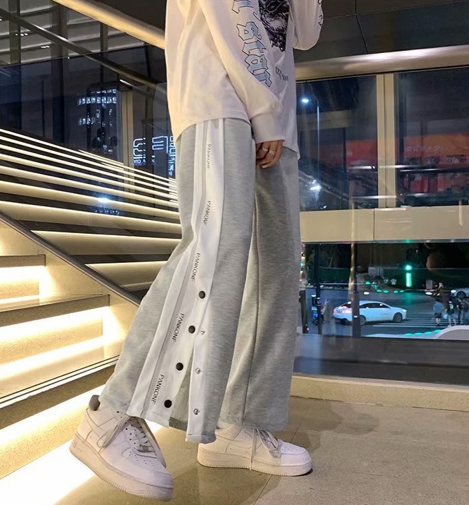 サイドボタンパンツ2色スウェットジャージ下ボトムスズボンゴムロングワイド太いストレートロゴグレー黒ブラック動きやすい大きいサイズビッグゆったりダンス衣装ヒップホップレディースメンズガールズ