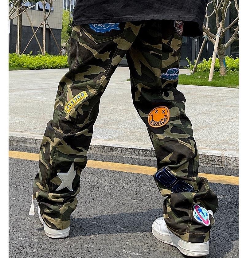 カモフラ迷彩パンツズボンボトムスロングワッペン刺繍ロゴ二コちゃんスマイルハート星スター虹カラフルカーキ総柄ハイウエストストレートダンス衣装ヒップホップレディースメンズストリート奇抜