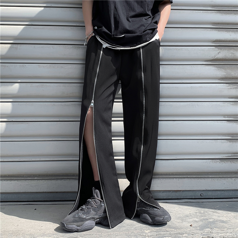 センタージップアップパンツズボンボトムスゴムロングワイド太い大きいサイズビッグ黒ブラック無地シンプルジッパーチャックジャージスウェットダンス衣装ヒップホップレディースメンズガールズストリー