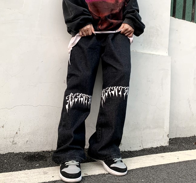 ロゴプリントデニム2色ジーンズジーパンパンツズボンボトムス黒ブラック白ホワイトハイウエストロングストレートワイド太い大きいサイズダンス衣装ヒップホップHIPHOPレディースメンズガールズストリート奇抜