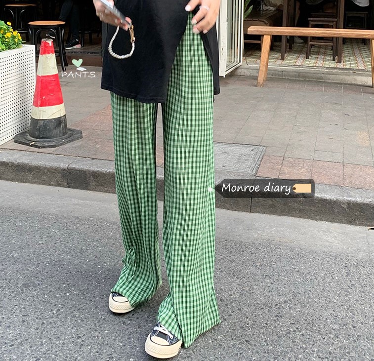 チェックリブパンツボトムスズボンロングストレートハイウエストゴム緑グリーンギンガムチェックダンス衣装ヒップホップHIPHOPレディースガールズストリート大人服ゆったり韓国おしゃれ可愛いワイドゆったり奇