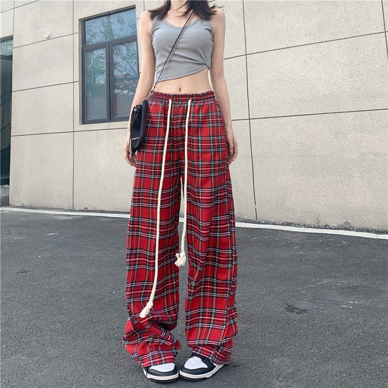 チェックリブパンツボトムスズボンロングストレートハイウエストゴム緑グリーンギンガムチェックダンス衣装ヒップホップレディースガールズストリート大人服ゆったり韓国おしゃれ可愛いワイドゆったり奇