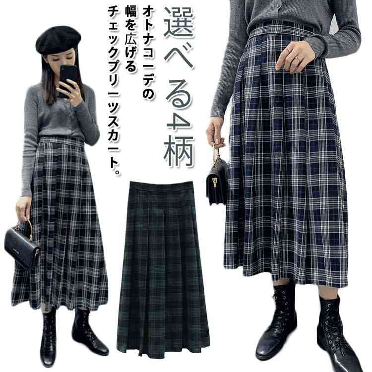 チェックプリーツスカート レディース Aライン ロング丈 選べる4柄 動き易い 着丈78cm ウェスト62~84cm 後ろ部分ゴム 後ろ部分ゴム