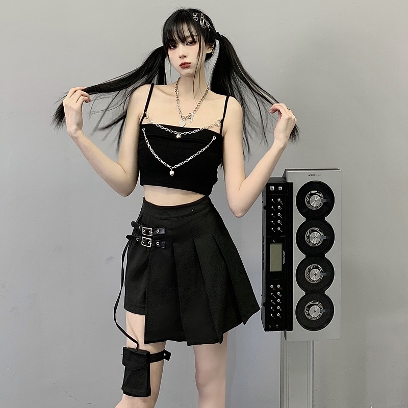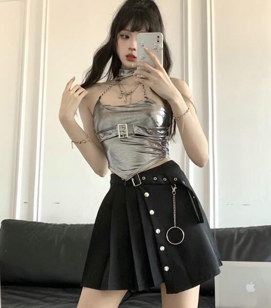 プリーツスカートキュロットスカパンチェック柄チェーン付きシンプルハイウエストミニスカミニ膝上ひざ丈ボトムスダンス衣装ヒップホップHIPHOPレディースガールズkpop韓国ストリート個性的奇抜派手