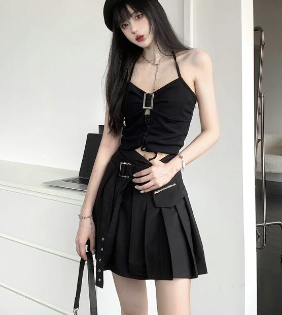 プリーツスカートキュロットスカパンベルト付きシンプルハイウエストミニスカミニ膝上ひざ丈ボトムスダンス衣装ヒップホップレディースガールズ韓国ストリート個性的奇抜派手
