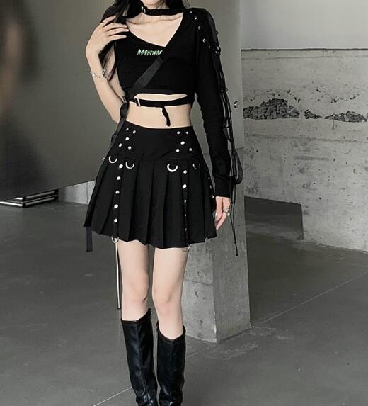 プリーツスカートキュロットスカパンベルト付きシンプルハイウエストミニスカミニ膝上ひざ丈ボトムスダンス衣装ヒップホップHIPHOPレディースガールズkpop韓国ストリート個性的奇抜派手