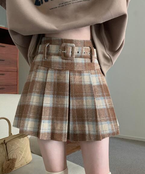プリーツスカート3色キュロットスカパンチェック柄シンプルハイウエストミニスカミニ膝上ひざ丈ベルトボトムスダンス衣装ヒップホップHIPHOPレディースガールズkpop韓国ストリート個性的奇抜派手