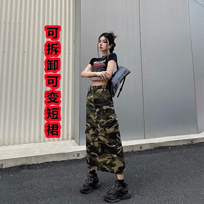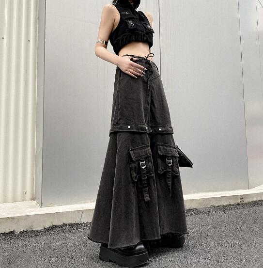 ♪S~XL展開♪2wayデニムジーンズスカートボトムスロング丈膝丈 ポケット切りっぱなし衣装ヒップホップHIPHOPレディースガールズ韓国個性的奇抜派手