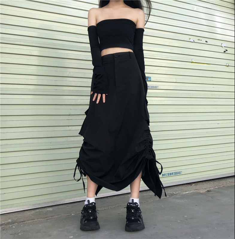 スカート スリット 不規則 アシンメトリー ギャザー シャーリング シワ 切り替え 無地 原宿系ファッション 韓国風 ダンス 衣装 ダンサー ヒップホップ 個性 奇抜 かわいい 青文字系