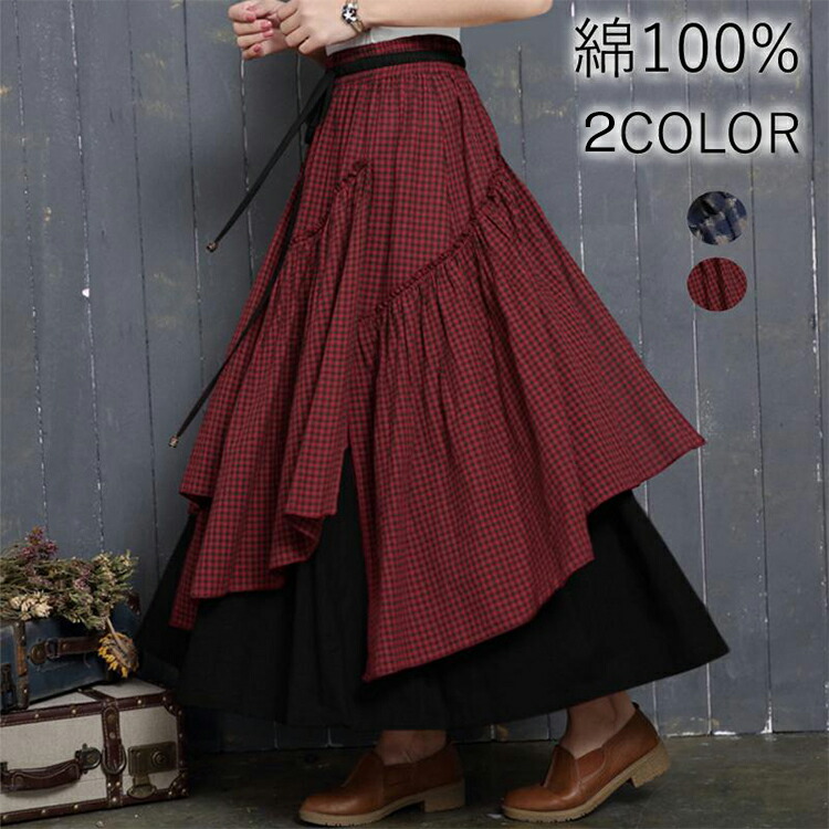 アシンメトリー チェック柄 スカート レディース 春 夏 ロングスカート 変形スカート 綿100% スカート マキシ丈 フレアスカート ボトムス チェック柄 ヘムライン ウエストゴム アレンジ 調節