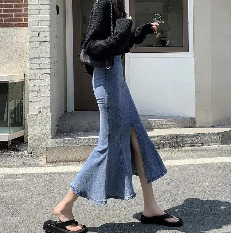 マーメイドデニムスカートタイトスカートストレッチ美ライン伸縮性ボトムス ハイウェストスリット入りロングスカート膝下丈マキシスカート