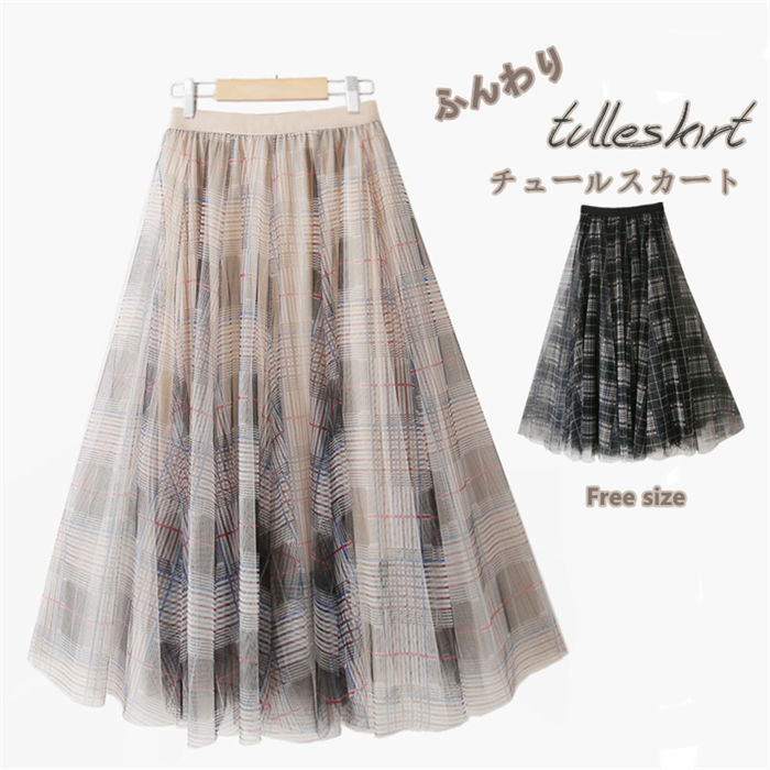 スカート チュール ボトムス レディース ブラック 春夏 チュールスカート ロングスカート フレアスカート ロング丈 ふんわり マキシ丈 チェック柄