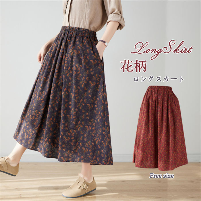 花柄ロングスカート ボトムス スカート レディース 綿 ゆったり Aライン フレア 花柄 綿混 女性 スカート ロング プリーツスカート