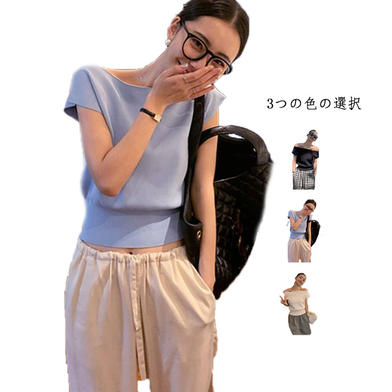 半袖 ニットトップス 春夏 ボートネック カットソー レディース ニット シャツ 肌見せ おしゃれ
