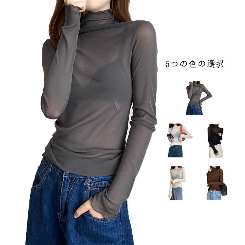 重ね着 透け感 レディース 長袖 シアートップス シャツ カットソー チュールトップス ハイネック インナー 肌見せ きれいめ