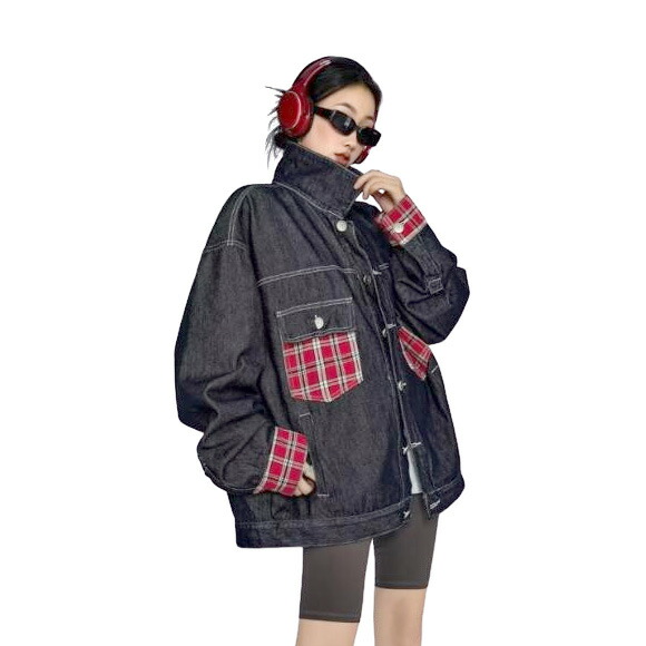 チェック柄切替ジージャンデニムジャケット長袖Gジャンブラック黒レッド赤ブルー青ボタンポケットビッグ大きいサイズダンス衣装ヒップホップHIPHOPレディースメンズガールズ大人ストリートアウタージャンパー