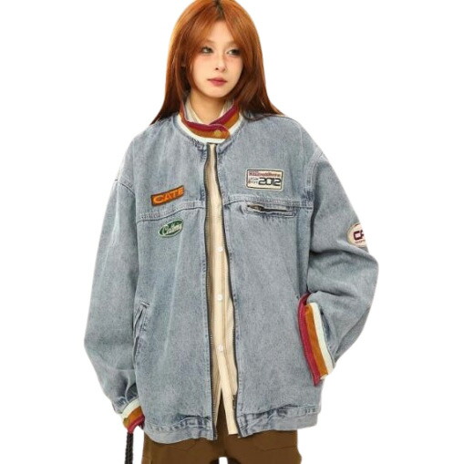 ワッペン刺繍ジージャンデニムジャケット長袖ジャンブラック黒ブルー青ボタンポケットビッグ大きいサイズダンス衣装ヒップホップレディースメンズガールズ大人ストリートアウタージャンパー韓国