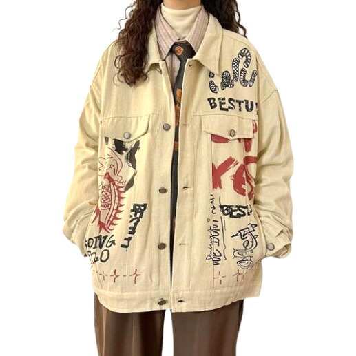プリントロゴジージャンデニムジャケット長袖ジャンボタンポケットビッグ大きいサイズダンス衣装ヒップホップレディースメンズガールズ大人ストリートアウタージャンパー韓国