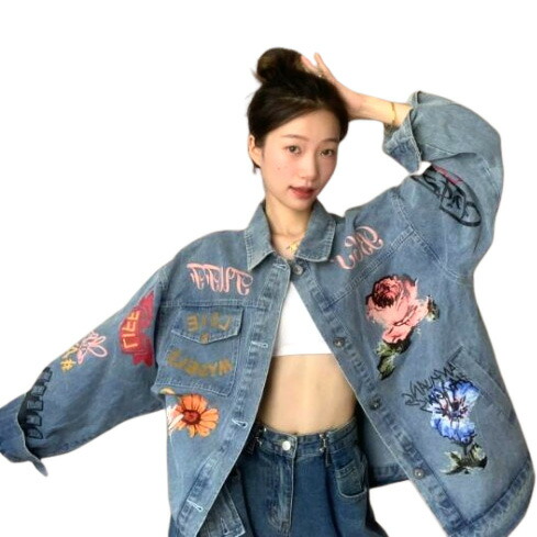 ちょうちょ花柄ジージャンデニムジャケット長袖ジャンボタンポケットビッグ大きいサイズダンス衣装ヒップホップレディースガールズ大人ストリートアウタージャンパー韓国