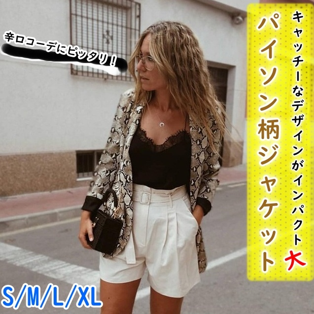 レディース ジャケット アウター 羽織りもの スタイリッシュ パイソン柄 テーラードカラー ミディ丈 チュニック丈 長袖 ネック 襟付き 前開き 体型カバー ヘビ柄 アニマル柄 シンプル