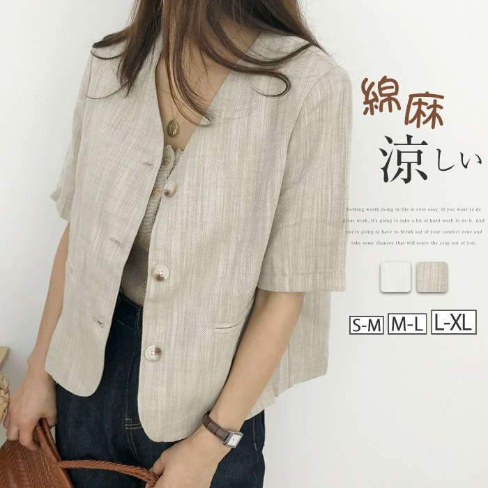 リネン風 半袖 ノーカラージャケット プレゼント 贈り物 ギフト 母の日 大きいサイズ ベージュ ホワイト 白 ♪