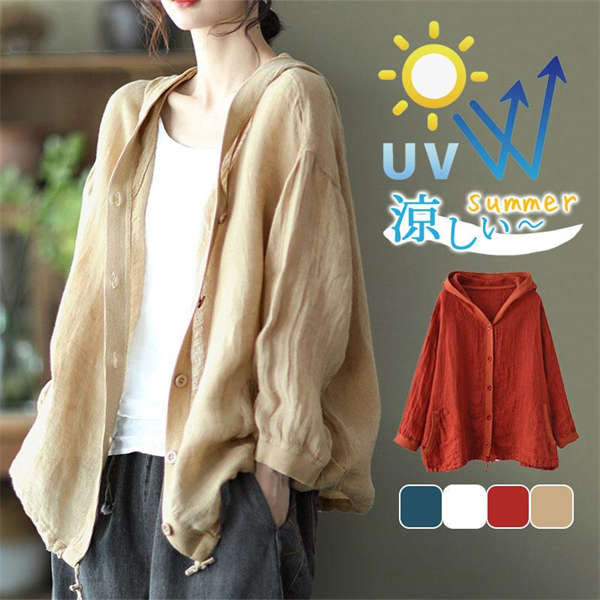 夏 レディース 春 トップス 綿麻 リネン フード付き サマー 涼しい アウター 薄手 uv 紫外線対策 長袖 羽織 冷房対策 オフィス
