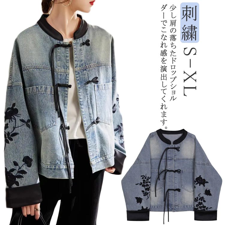 チャイナ風 ノーカラー デニムジャケット レディース 長袖 ショート アウター フラワー 刺繍 ジャン ジージャン 中華風 切り替え