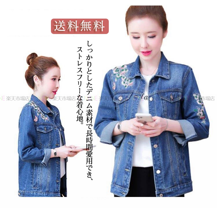 チャイナ風 ノーカラー デニムジャケット レディース 長袖 ショート アウター フラワー 刺繍 Gジャン ジージャン 中華風 切り替え