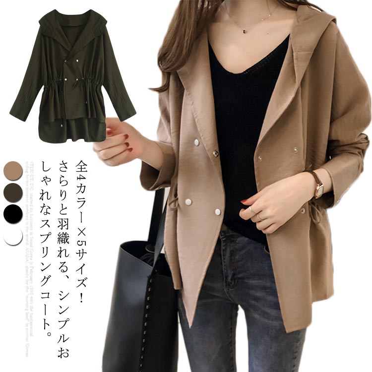 薄手 トレンチコート レディース スプリングコート ミディアム丈 ライトアウター ゆったり 綿混 羽織り フード付き ウエスト紐 春 アウター コート トレンチ カジュアルコート
