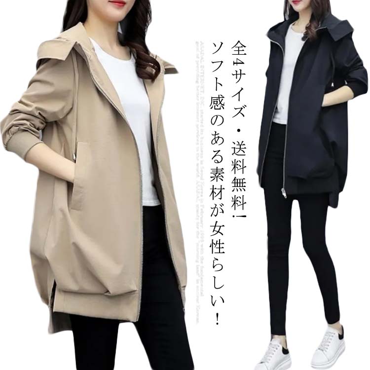 コート マウンテンパーカー アウター 夏 ロング丈 チュニック丈 羽織り フード付き ファスナー 体型カバー ブルゾン ジャンパー レディース 秋 春 ミドル丈 裏地あり