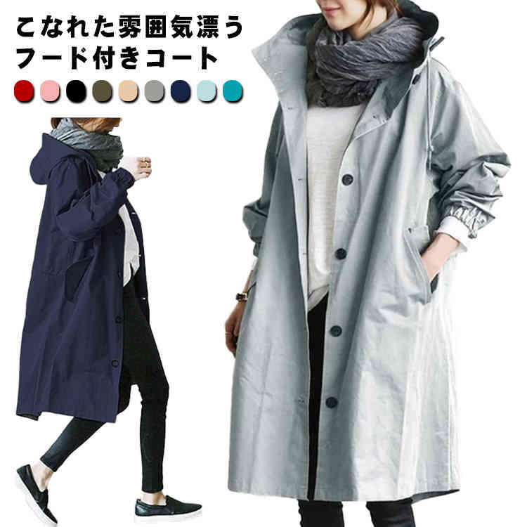 長袖 レディース 薄手 おしゃれ フード付き アウター トレンチコート 裏地あり コート カジュアル 無地 ボタン 軽量 通勤 秋 羽織り