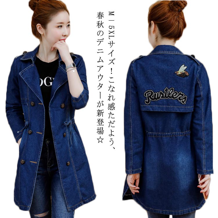 M-5XLサイズ デニムトレンチコート デニムアウター コート 刺繍入り カジュアルコート ミドル丈 ウエスト紐付き 大きサイズ レディース デニムコート ロングコート