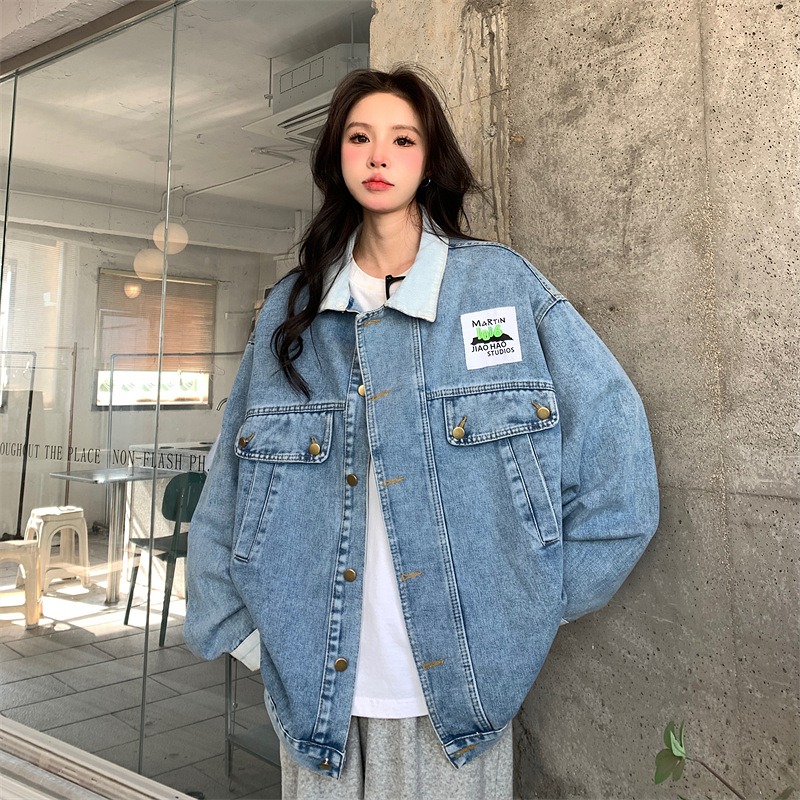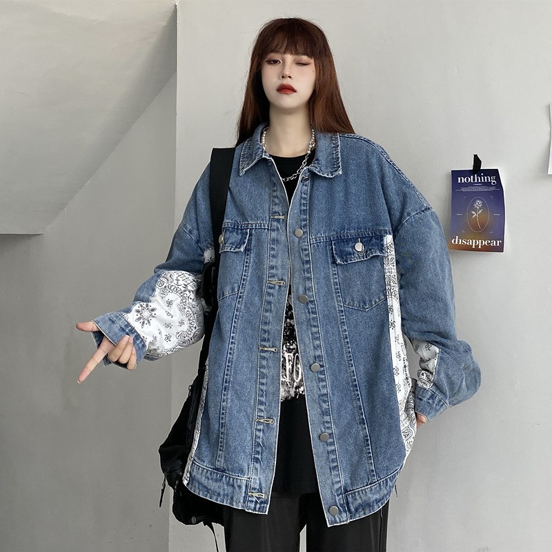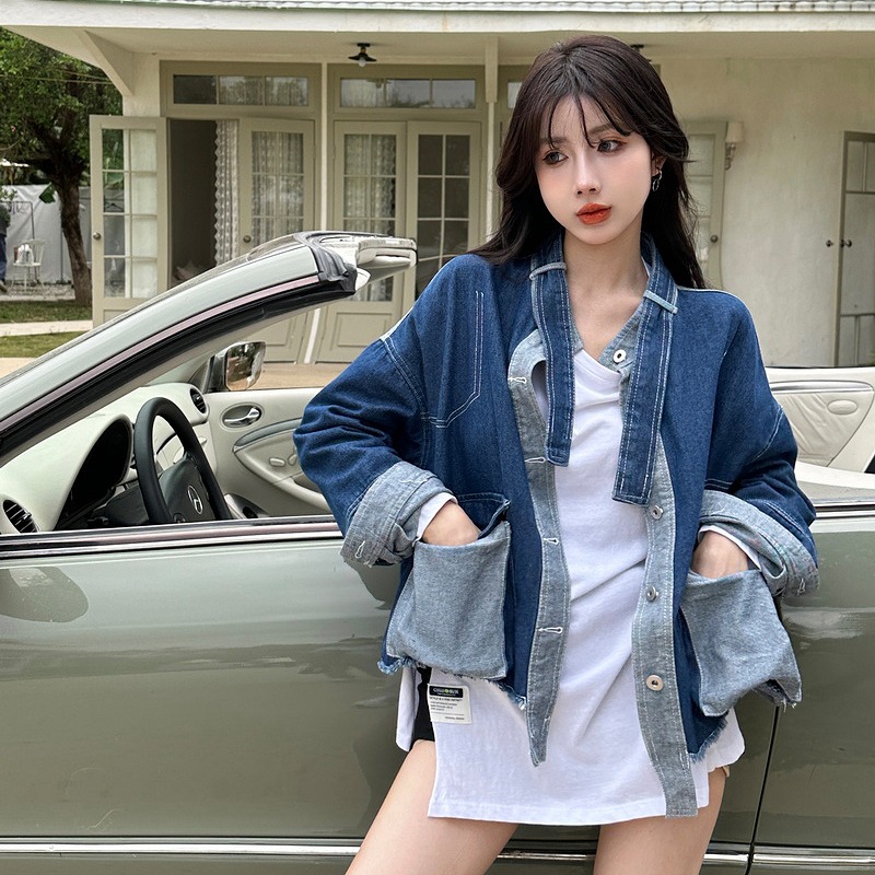 ジャケット コート 切り替え バイカラー 配色 体型カバー 長袖 デニム ヴィンテージ風 レトロ調 原宿系ファッション 韓国風ダンス 衣装 ヒップホップ 個性 奇抜 かわいい 青文字系