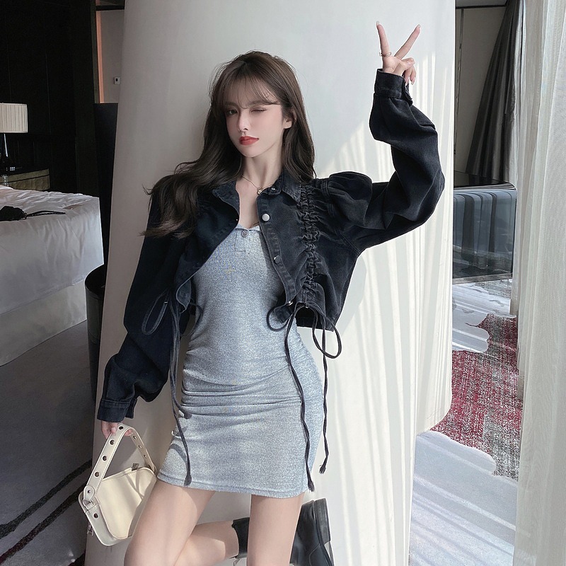 デニムジャケット ジージャン ジャン ショート丈 ギャザー シャーリング シワ 長袖 スリム デニム 原宿系ファッション 韓国風 ダンス 衣装 ダンサー ヒップホップ 個性 奇抜 かわ