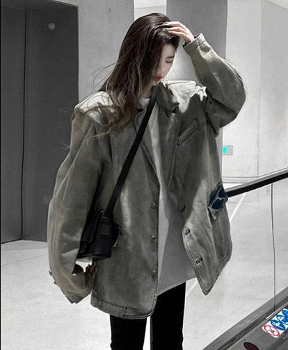 ジャケット コート 長袖 切り替え 体型カバー ヴィンテージ風 レトロ調 原宿系ファッション 韓国風 ダンス 衣装 ダンサー ヒップホップ 個性 奇抜 かわいい 青文字系 アウター コー