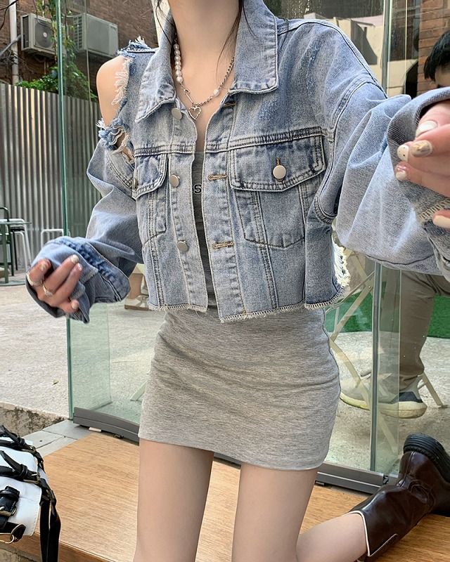 デニムジャケット ジージャン ジャン ショート丈 クラッシュ ダメージ加工 破損加工 長袖 切り替え デニム 体型カバー 原宿系ファッション 韓国風 ダンス 衣装 ダンサー ヒップホップ