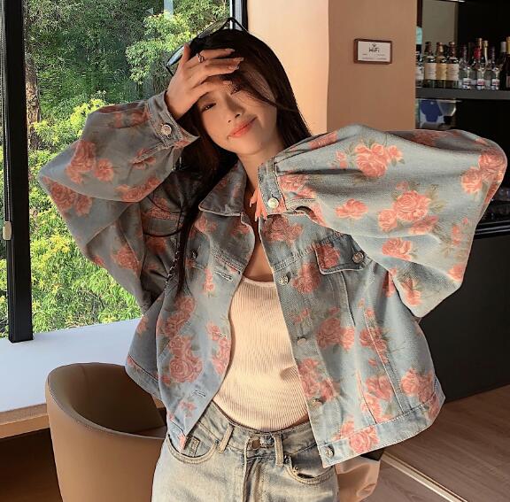 ♪~展開♪薔薇バラジージャンデニムジャケット長袖ジャンアウターダンス衣装ヒップホップレディースガールズストリート奇抜派手スケーター大きいサイズビッグ韓国カジュアルおしゃれ可愛いヴィ