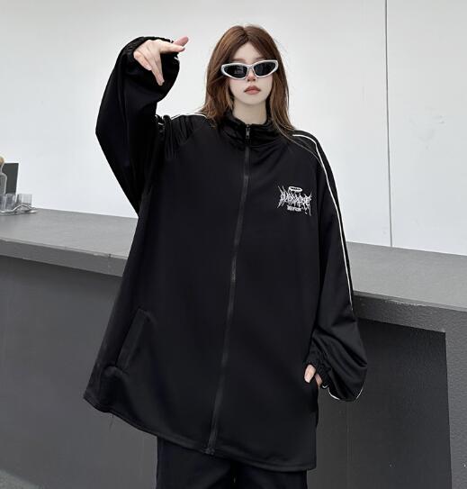 ♪~2展開♪2色ブルゾンジャケットジャンパー無地シンプルベルト黒ブラック白ホワイトビッグ大きいサイズヒップホップレディースメンズガールズ韓国個性的奇抜