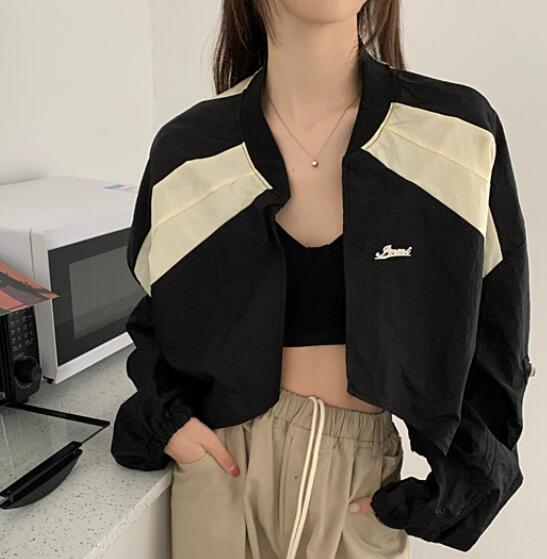 ショート丈アウターヴァーシティージャケットブルゾンスタジャン短い短めライダースジャンパースカジャンベースボールジャケットジャージ黒ブラックヒップホップレディースガールズストリート韓国おしゃ