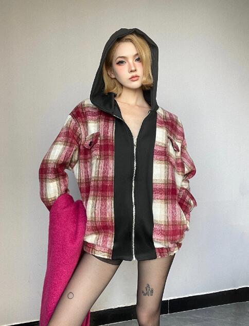 レトロチェック柄コートブルゾンアウタージャケットレディースガールズおしゃれ韓国ファッションゆったり大きいフードフーディーあったか厚手ストリート大人かっこいい