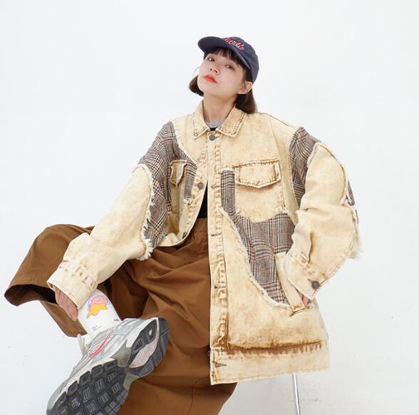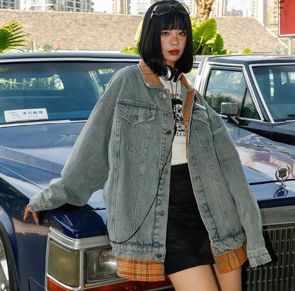 ジージャンデニムジャケットアウター長袖 ビッグシルエット ゆめかわいい 奇抜 派手 トップス ダンス衣装重ね着風チェック柄 韓国ファッション 大きいサイズ 個性的 服 原宿系オーバーサイズ レディース