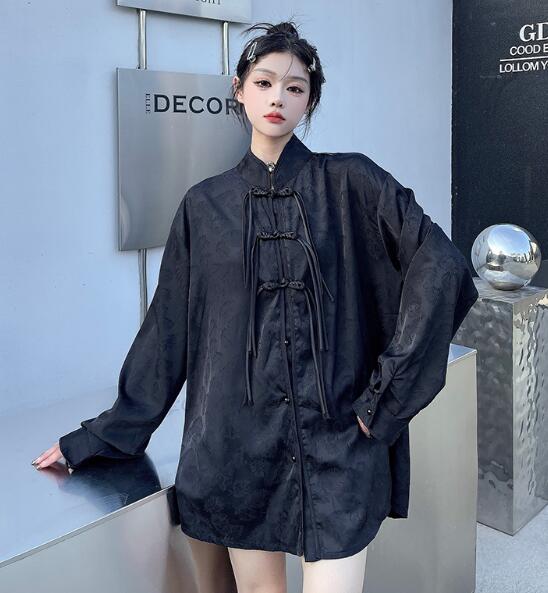 チャイナジャケットアウタージャンパー長袖黒ブラック大きいサイズビッグゆったりブラウスシャツチャイナボタンチャイナ服チャイナ風シンプルポケット前開きダンス衣装ヒップホップHIPHOPレディースメンズガー