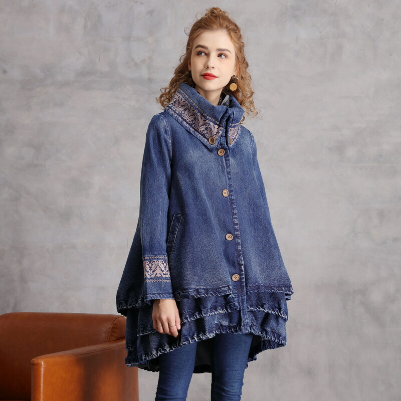 秋 冬 レディースアウター コート デニムコート レディースジャケット レトロ スプリングコート ドレスコート 刺繍 エスニック クラシック クラシカル チャイナボタン チャイナ風 デニムワンピース