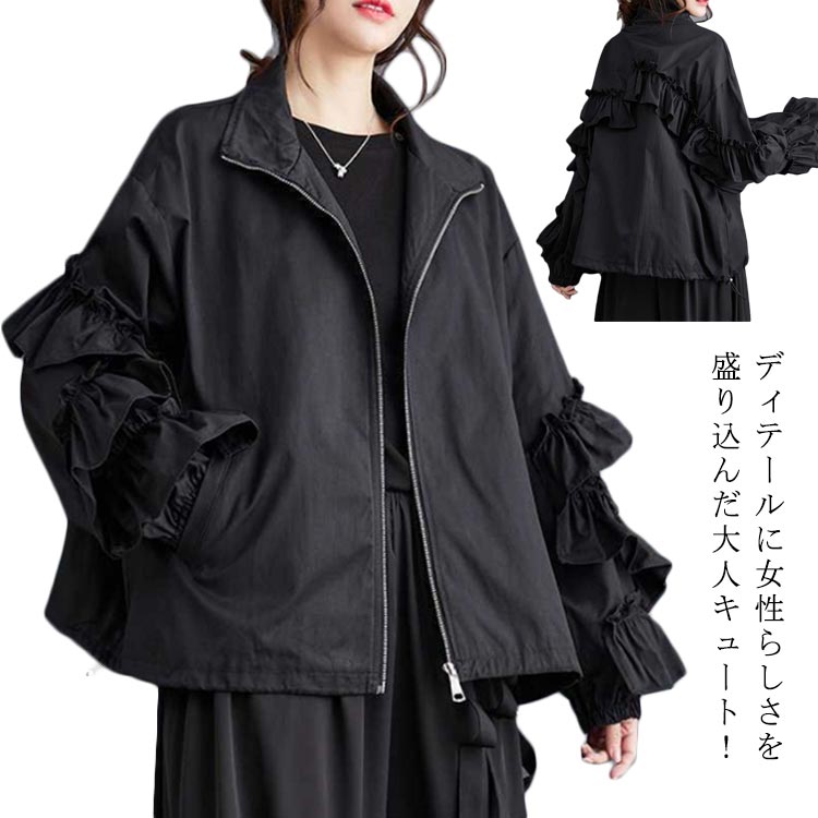パフスリーブ レディース 春 ジャケット スタンドカラー ブルゾン フリル かわいい ティアード きれいめ