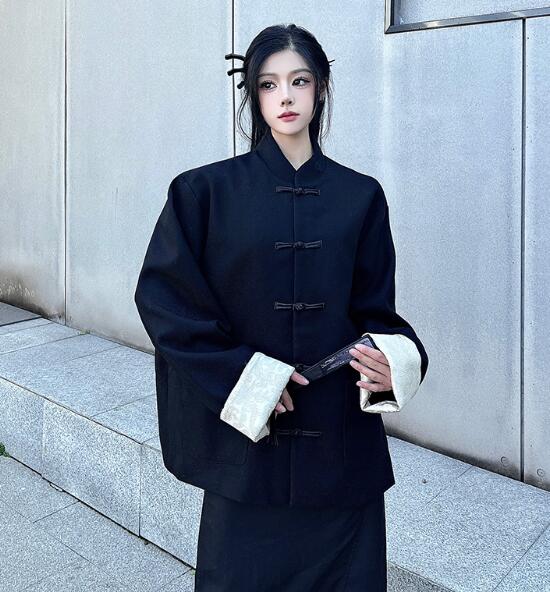 モード系 チャイナジャケットアウター長袖黒ブラック大きいサイズビッグゆったりチャイナボタンチャイナ服チャイナ風シンプルポケット前開きダンス衣装ヒップホップレディースメンズガールズ奇抜