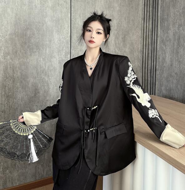 モード系長袖鶴チャイナ風 ビッグシルエット ゆめかわいい 奇抜 派手 ジャケット アウター ダンス 衣装 ヒップホップ コスチューム 韓国ファッション 大きいサイズ 個性的 服 原宿系オーバーサイズ