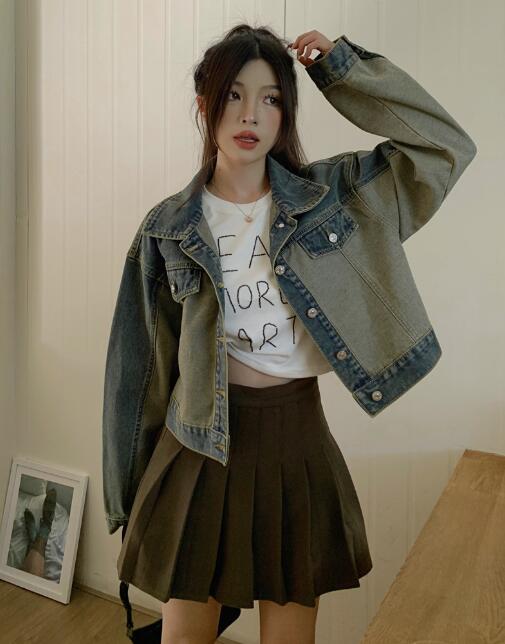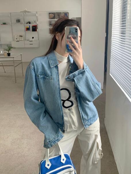 ショート丈ジージャンデニムジャケット短い長袖ジャン青シンプルボタンビッグ大きいサイズダンス衣装ヒップホップレディースガールズ大人ストリートアウタージャンパー韓国
