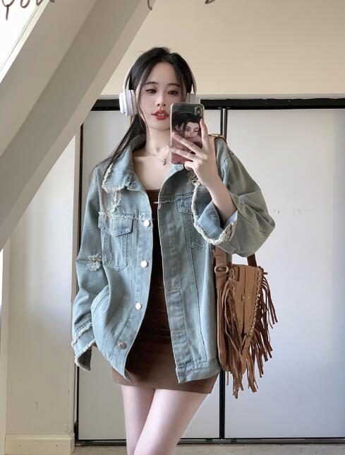 ジージャンデニムジャケット長袖ジャンダメージ破れ加工青シンプルボタンポケットビッグ大きいサイズダンス衣装ヒップホップレディースガールズ大人ストリートアウタージャンパー韓国