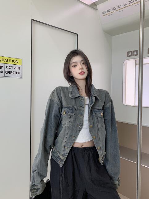 ショート丈ジージャンデニムジャケット短いへそ出し長袖ジャン青シンプルボタンポケットビッグ大きいサイズダンス衣装ヒップホップレディースガールズ大人ストリートアウタージャンパー韓国ファッショ
